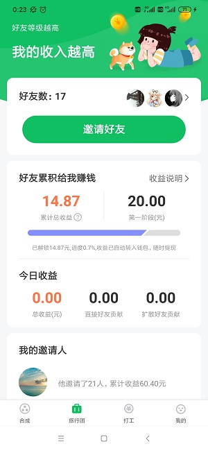旅行团是旅行日记APP的邀请收益系统,根据邀请直邀好友、扩散好友的活跃时长、任务完成情况、看视频贡献比例、邀请好友数量等因素综合计算。好友越多,每天坐享活跃收益越多。