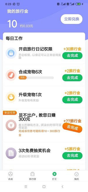 旅行金可用于兑换现金,可通过打工频道进行每日工作;合成宠物次数、幸运任务、阅读、签到等任务,完成任务就能获得相应的旅行金奖励。